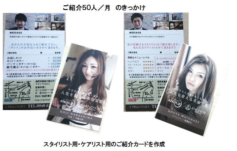 飯塚市アンカー中嶋社長よりいただいたスタイリストとケアリストの紹介カード。カードの裏は“自分たちで撮影したモデル”