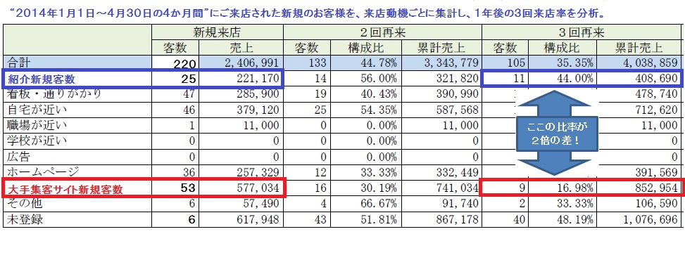 ある4か月間の新規客数を分析。紹介新規と集客サイト新規では、3回来店率は“3倍”近い差になります!