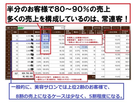 ちなみに私は、美容室のマネジメントをお手伝いする時に『平均客単価』『平均来店サイクル』をあまり重要視しません!なぜなら、上位4割のお客様が売上の8割を作ってくれているなら、「売上」を構成する「客単価・来店サイクル」等の重要な数字の8割も、上位4割のお客様によって作られているから!